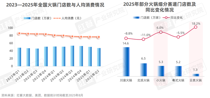 与此同时,在性价比消费需求增长的趋势下,火锅人均消费持续下滑。红餐大数据显示,截至2025年8月,全国火锅门店人均消费已降至76.7元,较2023年第一季度(86.5元)下降了11.3%。