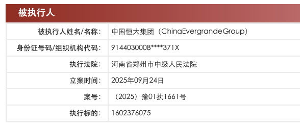 中国执行信息公开网显示,9月24日,中国恒大集团、郑州恒泽通健康置业有限公司、河南恒鹏健康产业有限公司新增一则被执行人信息,执行标的16亿余元,执行法院为河南省郑州市中级人民法院。