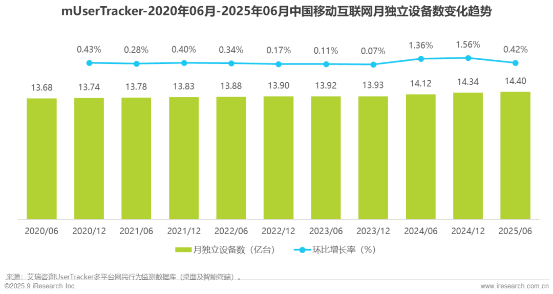 截至2025年6月,中国移动互联网月独立设备数接近14.5亿台,用户基数持续扩大,但增长动能已从人口红利转向6G、AI及新兴非手机类智能终端(如XR设备、车联网)。