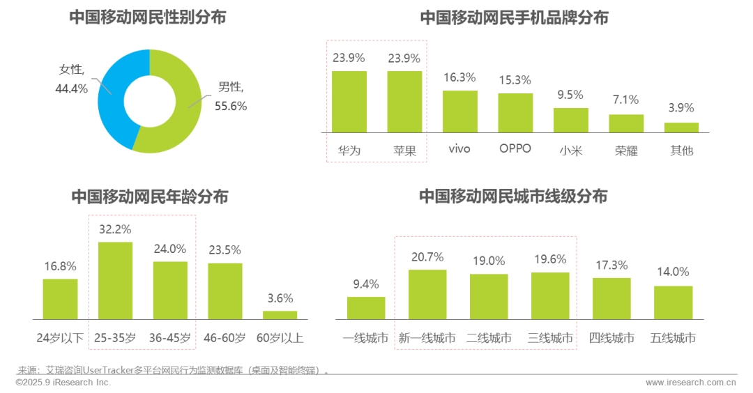 中国移动网民中男性用户略多于女性用户。25-45岁中青年群体合计占比达56.2%,构成移动互联网核心群体,该群体普遍具备较高消费能力和数字化服务使用习惯。46岁及以上用户群体合计占比 27.0%,表明移动互联网在中年和老年群体中的渗透率已经相当可观。手机头部品牌竞争呈现双雄格局,华为与苹果市占率相差无及,显示出高端手机市场竞争已进入白热化阶段。新一线至三线城市用户合计占比达59.3%,反映出下沉市场已成为移动互联网用户增长的主要来源。