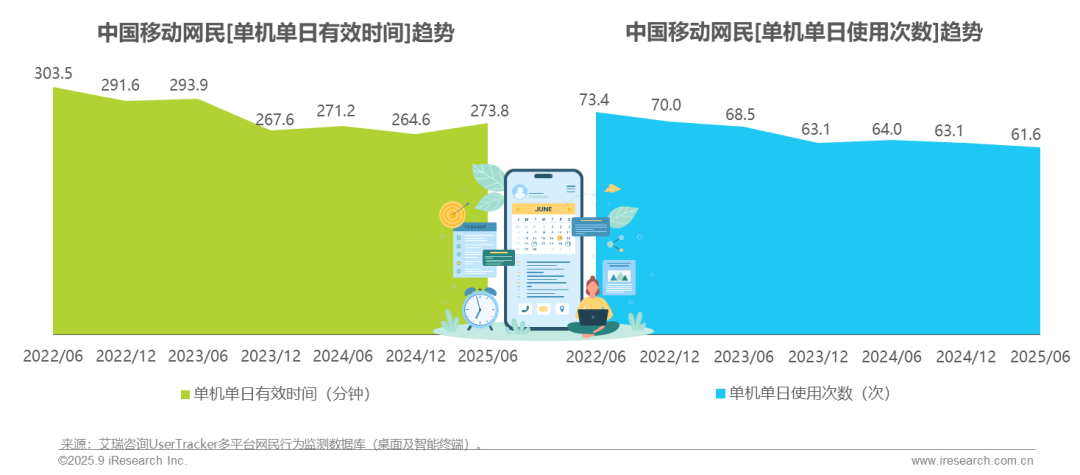 中国移动用户粘性指标:单机单日有效时间从303分钟降至273分钟、单机单日使用次数从73次降至61次,呈现持续的双降趋势。这一变化是多重因素叠加作用的结果:首先,自2022年起,针对游戏、短视频和社交媒体实施的更严格未成年人保护与反沉迷措施(如强制启用“青少年模式”),直接压缩了娱乐类应用的使用时长。其次,2023年疫情防控政策调整后,线下消费(餐饮/旅游/线下娱乐)显著反弹,用户时间被分流,线上时长进一步减少。同时,内容生态变化也产生影响:短视频、资讯等内容同质化加剧,用户新鲜感下降,“无效刷屏”行为减少,转向更高效的信息获取方式。展望未来,艾瑞咨询认为,AR/VR硬件的加速普及可能将部分使用场景从手机迁移至新终端。尽管被动推送减少的趋势不可逆转,但高频刚需场景(如社交、支付)预计仍将保持稳固。