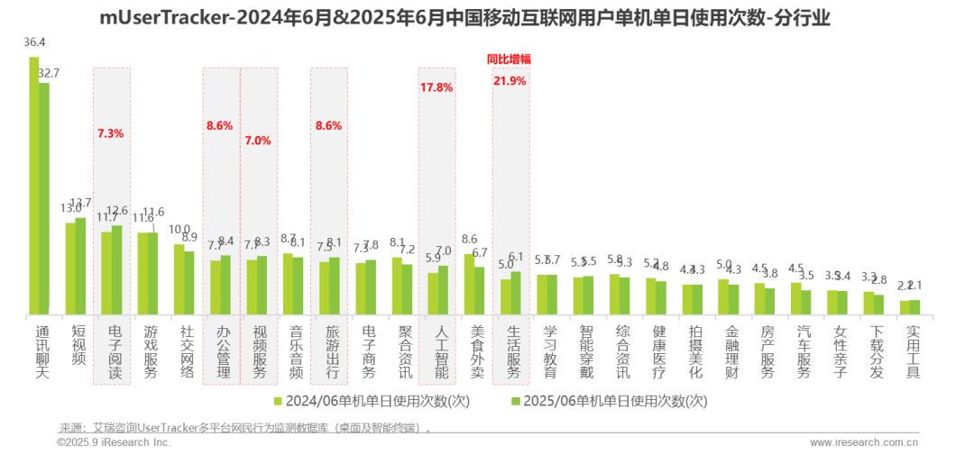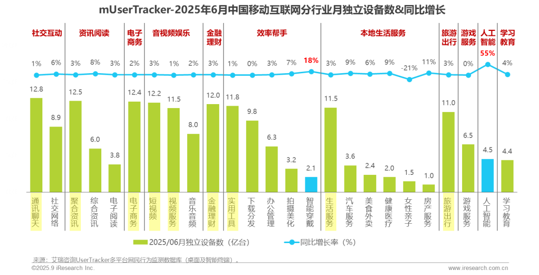 艾瑞监测数据显示,2025年6月用户的高频应用为通讯聊天(32.7次)、其次是短视频、电子阅读、游戏服务等(均超过10次),构成用户日常核心使用场景;高增长应用包括生活服务(增幅21.9%)、人工智能(增幅17.8%),以及旅游出行、办公管理、电子阅读、视频服务等(增幅8%左右)。外卖平台会员体系升级、抖音本地生活服务全面下沉、社区团购与即时零售融合等使得生活服务获得爆发式增长,APP打开频次激增。AI技术对日常工具的渗透,使得用户主动触发次数飙升。艾瑞咨询认为,生活服务的刚性需求和AI技术渗透将继续推高用户使用频次,粘性最高的通讯工具则有望集成AI助手、生活服务、支付等成为超级入口化的全能平台。