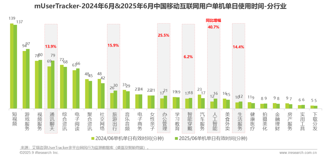 艾瑞监测数据显示,2025年6月用户使用时间TOP3为短视频(137分钟)、游戏服务(97分钟)、视频服务/通讯聊天(80分钟);同比增幅最大的是人工智能(40.7%)、办公管理(25.5%)、旅游出行/生后服务/通讯聊天(超过10%)。人工智能呈现爆发式增长主要源于技术突破,AI助手、AIGC创作工具等提升用户粘性;办公管理的高增长主要源于远程办公的深化,企业移动办公需求刚性化,推动了钉钉、企业微信等移动工具的普及和使用。艾瑞咨询认为,随着生成式AI深度融合各行业(如AI+教育、AI+医疗),未来人工智能使用时长将继续大幅度增加;智能穿戴随着无创血糖监测、脑机接口等技术商用的带动,有望在6%增幅基础上有所提升。