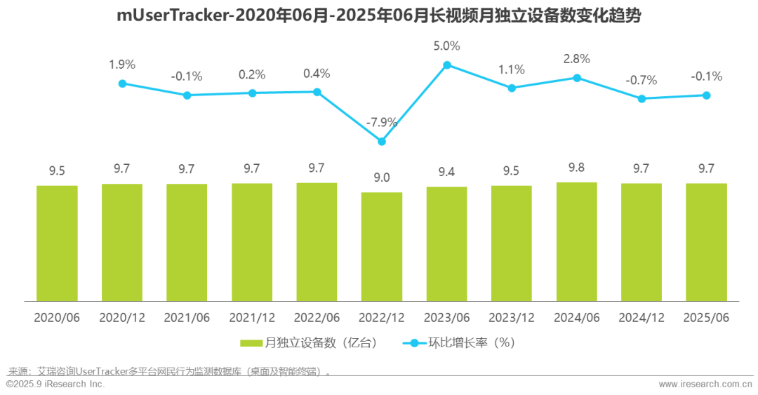 长视频类应用的月独立设备数在2020–2025年期间整体保持平稳低增长,反映出该领域已从高速成长期步入成熟稳定期。其中2022–2023年间的增速出现较大高低波动,主要是疫情政策调整后,社会逐渐恢复正常运转,以及市场竞争加剧等因素影响。艾瑞咨询认为,长视频用户渗透率已经到达天花板,新增用户极其有限。未来长视频的增长将更依赖于内容创新、技术升级和跨场景融合。