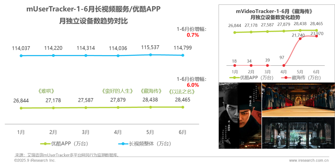 2025年1-6月期间,长视频整体用户规模保持平稳状态,增幅仅为0.7%,而优酷APP1-6月增幅达到6%,在长视频APP中增速第一,尤其从5月份开始,用户规模数量级从2.7亿增长到2.8亿。优酷APP用户规模在上半年的高增长主要得益于平台一系列在古装、悬疑、都市等赛道布局的类型化剧集,如现代偶像剧《难哄》、都市民生剧《蛮好的人生》、古装权谋剧《藏海传》、司法检察剧《以法之名》等。尤其是 《藏海传》这样的现象级大剧,凭借商业性、艺术性和文化性有机结合,为优酷APP带来了热度、口碑、用户和商业的多重丰收,并对优酷APP用户规模的增长产生了巨大的拉动效应,证明其在国内视频平台中的强劲竞争力。