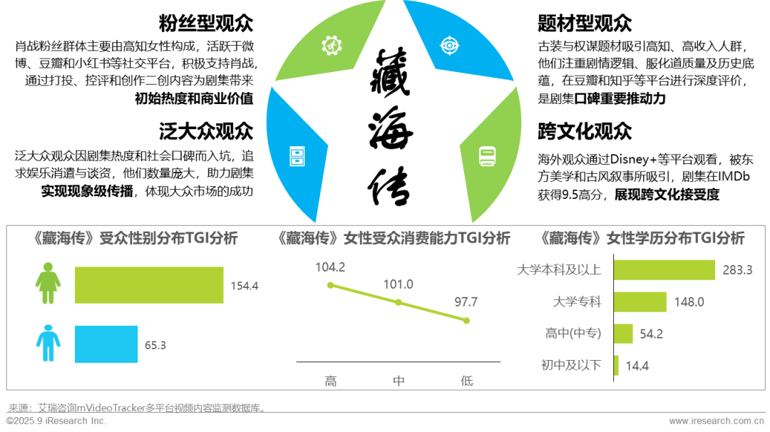 《藏海传》受众里,女性占比的TGI、以及高消费能力高学历女性群体占比的TGI明显高于移动端视频受众的整体水平。且《藏海传》是由多个圈层交汇融合形成的“破圈”型受众,呈现出典型的“核心粉丝引爆+品质吸引圈层+口碑破圈大众”的路径。该剧成功地将流量明星的号召力转化为了高品质剧集的吸引力,从而触达了远比粉丝群体广泛得多的观众,成为一部兼具热度、口碑和商业价值的全民级、甚至国际级的爆款作品。