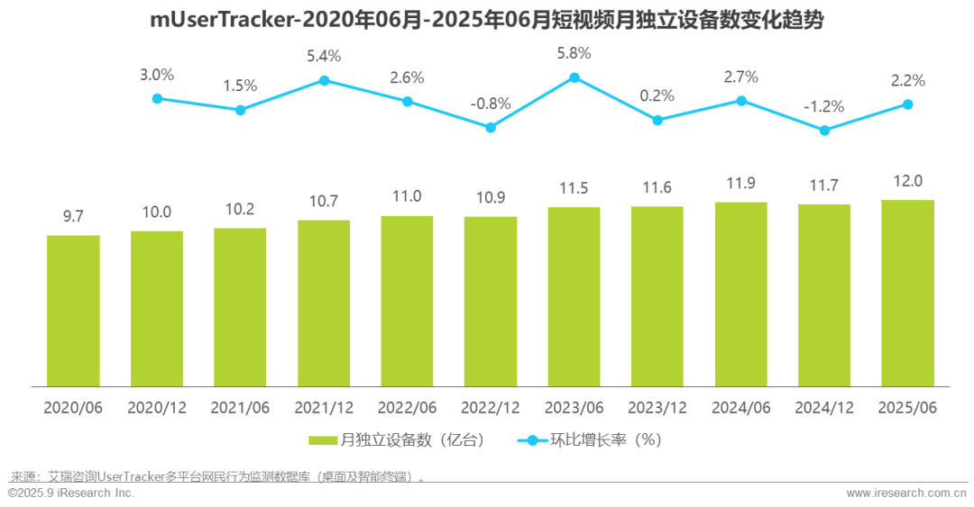 2020年6月至2025年6月,短视频的发展轨迹清晰地展示了从爆发增长到存量深耕的转变。2020-2021年:疫情期间线上需求爆发,短视频用户规模高速增长。2022-2023年:用户规模逐步逼近天花板,增速明显放缓,行业竞争加剧。2024-2025年:市场进入深度存量竞争阶段。艾瑞咨询认为,截至2025年6月用户规模虽维持高位,但增长乏力,网民总量红利见顶,加之微短剧作为新兴业态迅猛发展,对传统短视频浏览形成一定分流。未来,短视频行业的竞争将更聚焦于用户时长的深耕、商业模式的创新及技术的应用(如AI提升内容生产与分发效率),而非单纯的设备数增长。