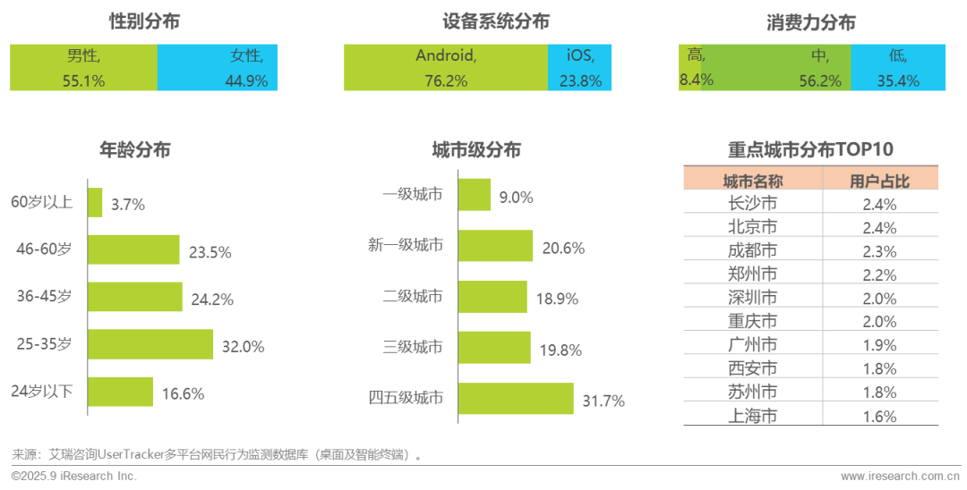 用户画像显示,25-45岁中青年群体为核心用户;46岁及以上中老年渗透显著;下沉市场(新一线至三线城市)用户占比高,成为主要增长来源。用户行为呈现“量降质升”趋势:有效使用时间从303分钟降至273分钟,使用次数从73次降至61次,反映用户从被动消耗转向主动获取价值。