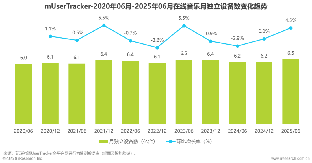 2020年6月至2025年6月,月独立设备数从6亿增加到6.5亿,增幅7.8%,表明在线音乐用户规模持续扩大,但增速趋于平稳,市场逐渐进入成熟期。期间出现三次波峰:2021年12月,版权政策放宽,多家平台获得更多歌曲授权,用户体验提升;2023年6月, AI推荐算法优化,个性化体验增强,以及线上演唱会、虚拟偶像等内容形式兴起;2025年6月,5G+VR/AR技术在音乐体验中的应用逐渐普及。艾瑞咨询认为,随着政策利好(如版权共享)与技术进步(AI、5G、VR)共同推动行业创新,未来VR/AR音乐会、全息演唱会将成为常态,AI生成音乐、个性化推荐将进一步精准化。用户规模增长可能进一步放缓,但ARPU(每用户平均收入)有望提升。