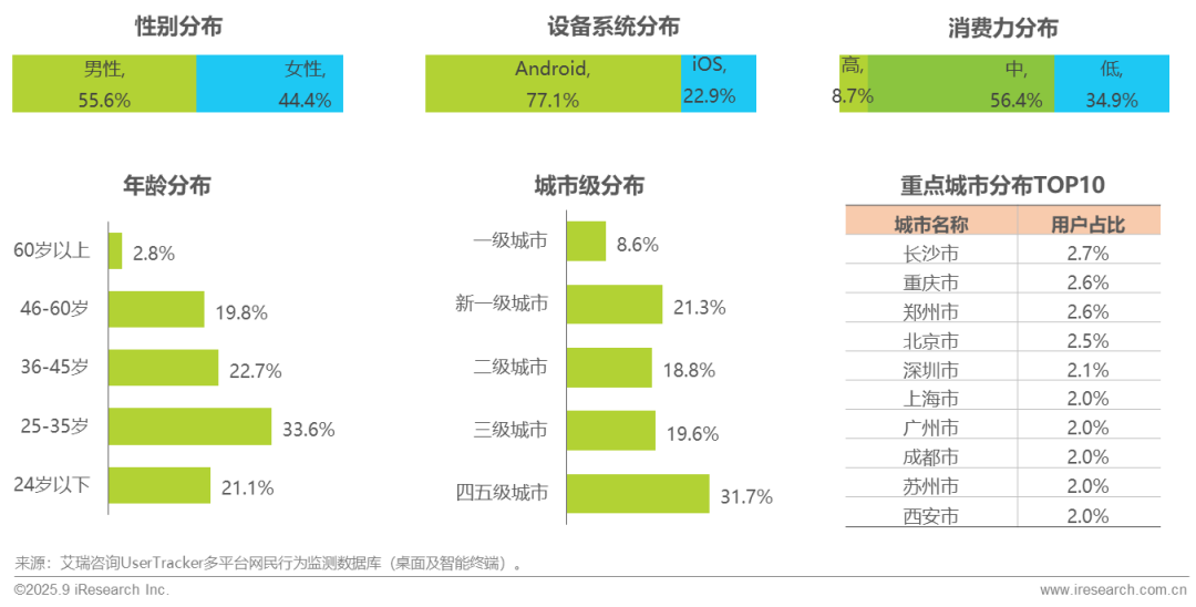 2025年6月,短视频用户呈现“全民化”与“下沉化”核心特征。用户性别分布均衡(男55.1%,女44.9%);中青年为主力,25-45岁用户占比超56%,同时银发族(60岁以上)以3.7%占比虽不大,但银发经济兴起下值得关注;超七成用户使用安卓设备;三四五线城市用户合计占比近半;中等消费能力用户占比56.2%,共同构成平台流量与变现的基石。艾瑞咨询认为,短视频用户是一个以中青年、安卓用户、中等消费者、下沉市场居民为主体,但同时全龄化、全民化特征显著的庞大群体。平台未来发展将聚焦全龄化深化与圈层化运营:适老化内容与银发经济、区域市场深度渗透及兴趣圈层精准运营将成为关键增长点。