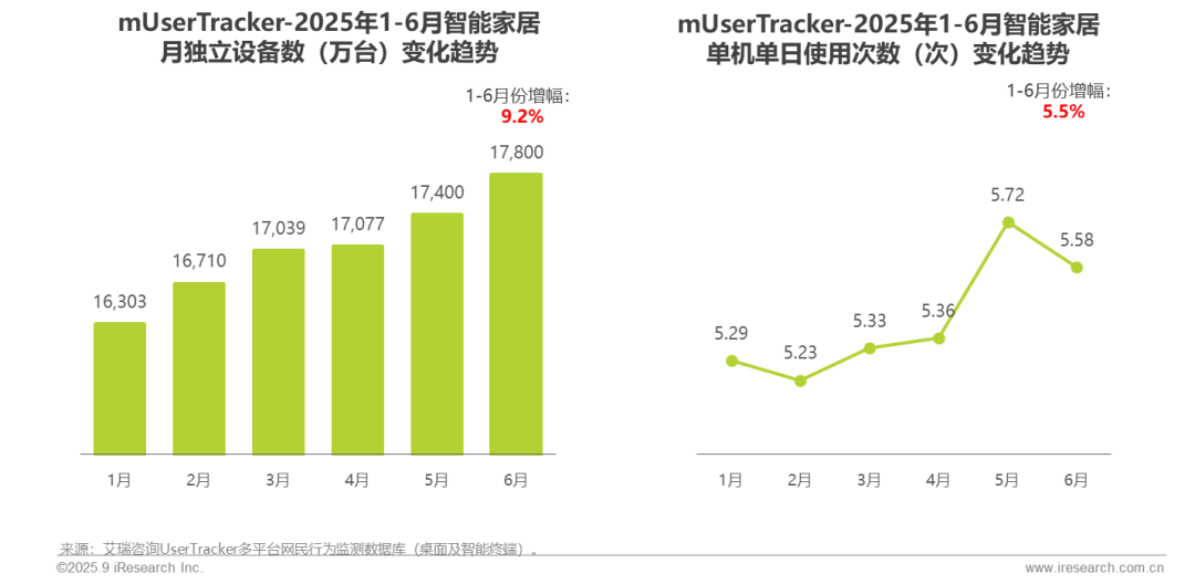 2025年1-6月,智能家居用户规模增长9.2%,单机单日使用次数增长5.5%,用户规模与使用频次双双提升,反映智能家居市场在持续复苏中,用户习惯逐步养成。艾瑞咨询认为,智能家居市场受益于全屋智能解决方案的推广,尤其在适老化改造与电动车联动场景中表现突出;加之2025年初多家厂商推出兼容Matter协议的设备,进一步降低了用户接入门槛,推动活跃度提升。
