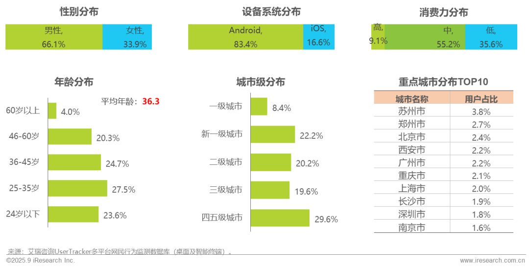2025年1-6月,智能家居用户平均年龄36.3岁,男性略多,iOS用户比例高,高线城市用户占比超60%,中高消费能力用户为主。艾瑞咨询认为,智能家居用户仍以一线和新一线城市的中高收入群体为核心,说明产品定价与功能设计仍偏高端;2025年适老化政策推动下,银发族市场潜力初显,但渗透率仍有提升空间。建议加强下沉市场布局与性价比产品线。