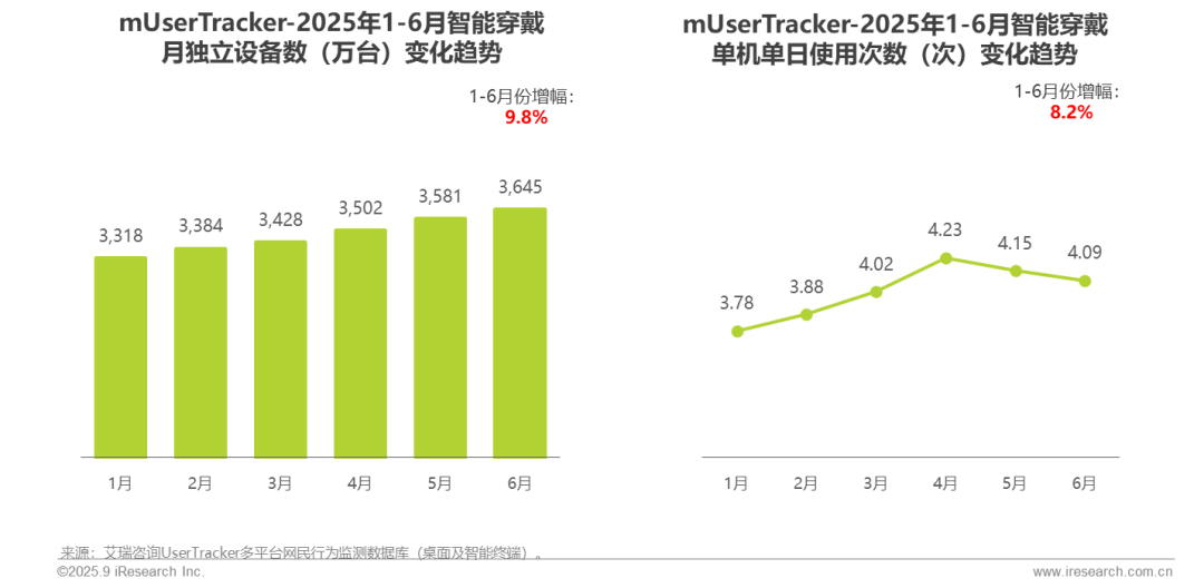 2025年1-6月,智能穿戴用户规模增长9.8%,单机单日使用次数增长8.2%,增速均高于智能家居,显示智能健康类穿戴设备需求旺盛。艾瑞咨询认为,2025年上半年,Apple Watch、华为健康腕表等新品支持医疗级ECG和血糖趋势监测,推动了用户活跃度的攀升;AI健康助手功能增强,用户依赖度提高,尤其在睡眠监测、压力识别等场景中表现突出。