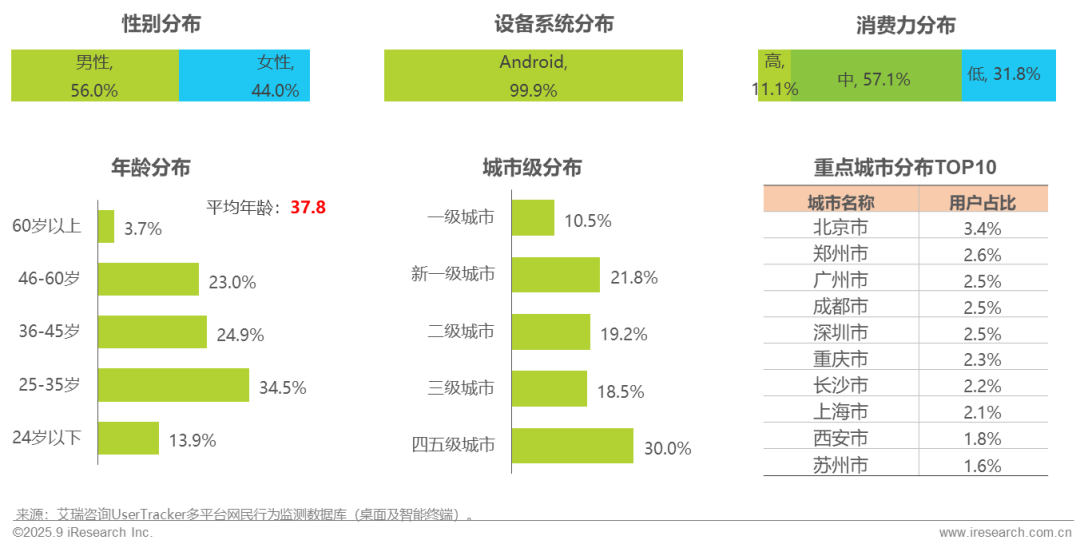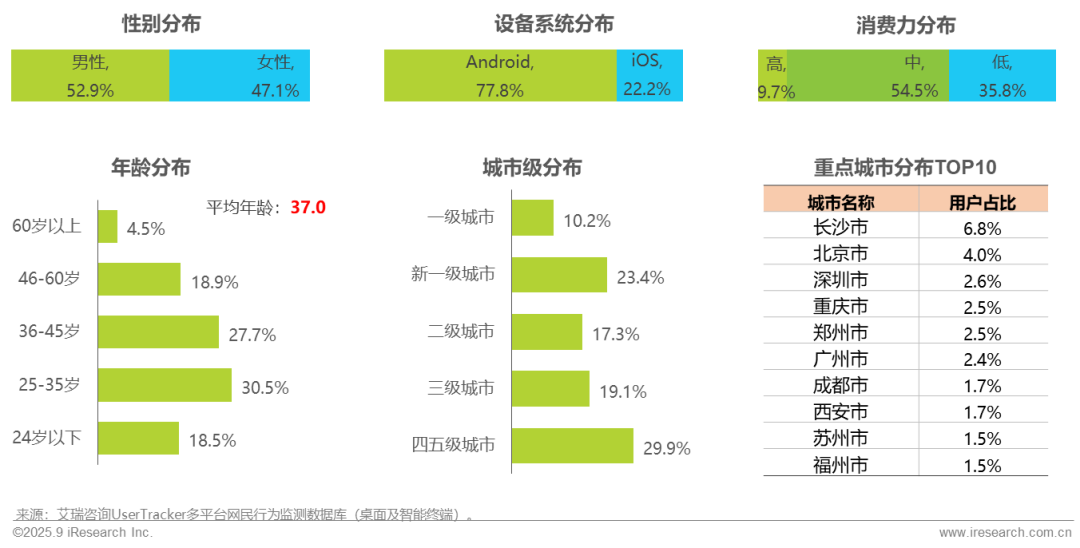 2025年1-6月,智能工具用户平均年龄37.8岁,男性为主,Android用户居多,下沉市场占比提升,消费能力中等。艾瑞咨询认为,智能工具APP用户逐渐向中低线城市扩散,说明基础智能功能(如语音搜索、快捷建议)在中高龄和下沉市场中仍有需求。2025年多家厂商推出适老版语音助手,带动银发群体使用率提升。
