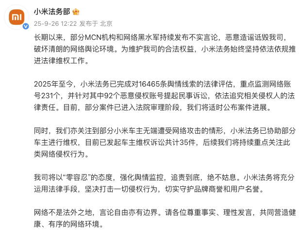 9月26日,小米法务部公布维权工作进展:2025年至今,小米法务已完成对16465条舆情线索的法律评估,重点监测网络账号231个,并针对其中92个恶意侵权账号提起民事诉讼,依法追究相关侵权人的法律责任。目前,部分案件已进入法院审理阶段,将适时公布案件进展。同时,其亦关注到部分小米车主无端遭受网络攻击的情形,小米法务已协助部分车主进行维权,目前已发起车主维权诉讼共计35件,后续将持续重点关注此类网络侵权行为。
