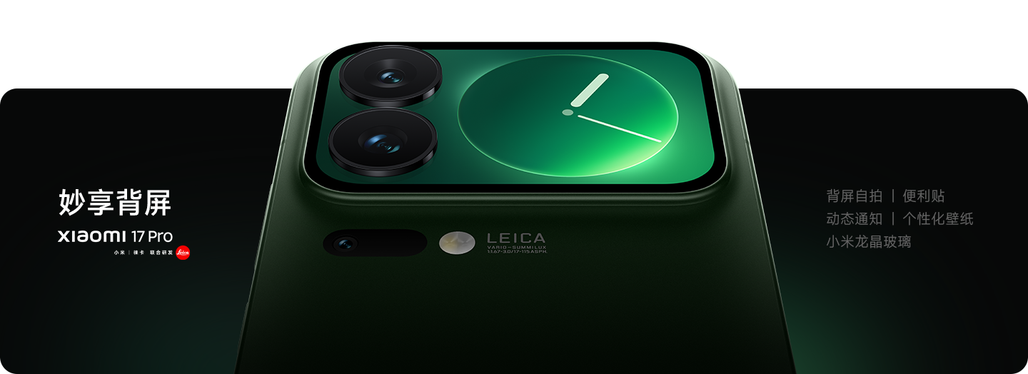 此番,小米在小米17 Pro系列上重推背屏设计,并依托动态刷新等去几年屏幕与软件技术的进步,在背屏功能玩法上也为用户带来 了“个性化的背屏壁纸、后置摄像头自拍、便利贴、动态通知”等相对于过往更为丰富的选择。