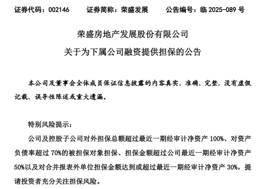 近日,荣盛房地产发展股份有限公司(以下简称“荣盛发展”,002146.SZ)发布了关于为下属公司融资提供担保的公告。