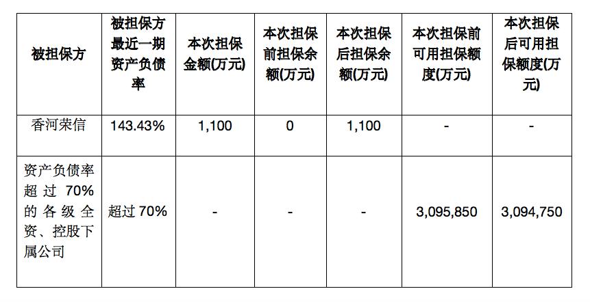 据了解,香河荣信成立于2019年3月27日,注册资本500万元,位于河北省廊坊市香河新兴产业示范园区,经营范围为房地产开发与经营;房地产经纪服务、物业服务;代收水电费。值得关注的是,被担保方香河荣信最近一期资产负债率高达143.43%。