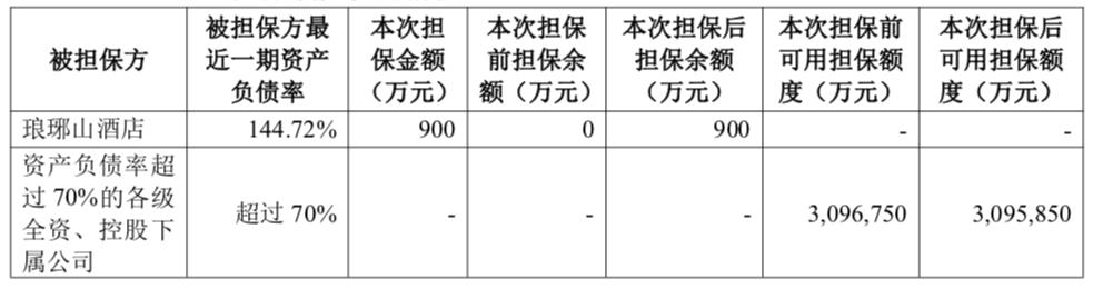 荣盛发展全资子公司滁州荣盛康旅旅游开发有限公司琅琊山荣逸山水酒店(以下简称“琅琊山酒店”)与滁州皖东农村商业银行股份有限公司丰乐支行拟继续合作,荣盛发展全资子公司滁州荣盛康旅旅游开发有限公司、南京荣盛康旅旅游开发有限公司、荣盛康旅投资有限公司为上述融资提供连带责任保证担保。担保本金总额不超过900万元,担保期限不超过48个月。值得关注的是,被担保方琅琊山酒店最近一期资产负债率为144.72%,远超70%。