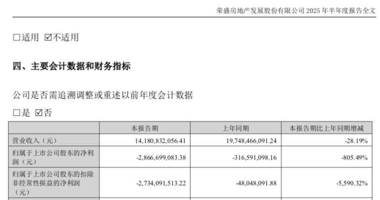 业绩方面,荣盛发展2025年上半年归属于上市公司股东的净利润为-28.67亿元,同比减少805.49%,归属于上市公司股东的扣除非经常性损益的净利润为-27.34亿元,同比减少5,590.32%。