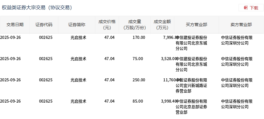 9月26日,光启技术大宗交易成交580万股,成交额2.73亿元,占当日总成交额的13.15%,成交价47.04元,较市场收盘价48.24元折价2.49%。