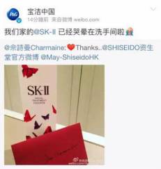 收到SK-II化妆品之后佘诗曼发了一条感谢微博,分别@了资生堂官微和资生堂香港公司总经理,但是SK-II是宝洁旗下的品牌。