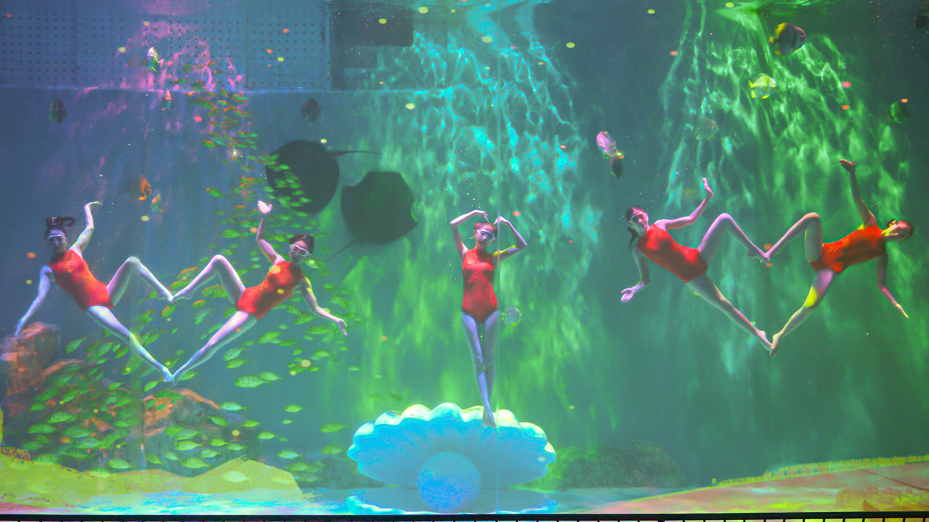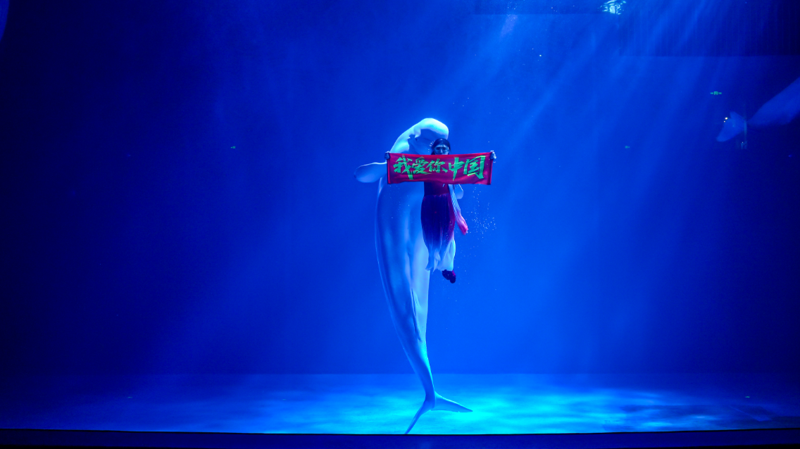 蔚蓝深海中,驯养师身着古风服饰,在激昂澎湃的配乐下与白鲸在水底共舞。当白鲸拥簇着驯养师,展开印有“我爱你中国”的红色条幅,台下响起阵阵掌声,观众们无不为之动容。