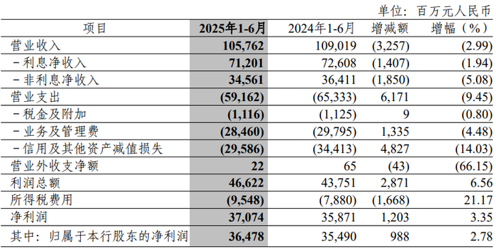 利润增长主要得益于营业支出的减少,其中信用及其他资产减值损失295.86亿元,同比下降14.03%;业务及管理费284.6亿元,同比下降4.48%。