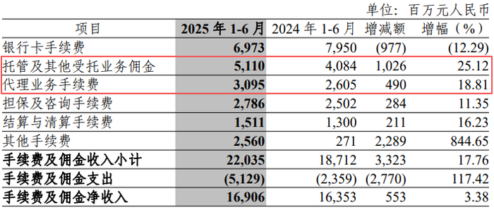 不过今年托管及其他受托业务佣金、代理业务手续费均迎来增长,上半年分别为51.1亿元、30.95亿元,同比分别增长25.12%、18.81%。资本市场持续升温,为财富管理业务带来了增长动能,驱动受托与代理业务手续费收入显著提升。