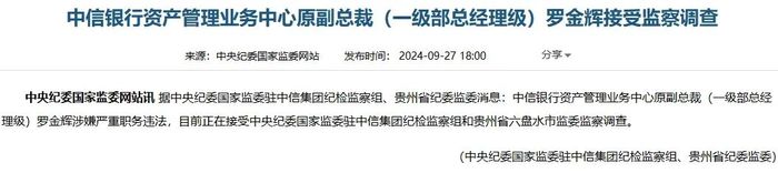 2024年9月27日,根据中央纪委国家监委网站发布的消息,中信银行资产管理业务中心原副总裁(一级部总经理级)罗金辉涉嫌严重职务违法,正在接受中央纪委国家监委驻中信集团纪检监察组和贵州省六盘水市监委监察调查。