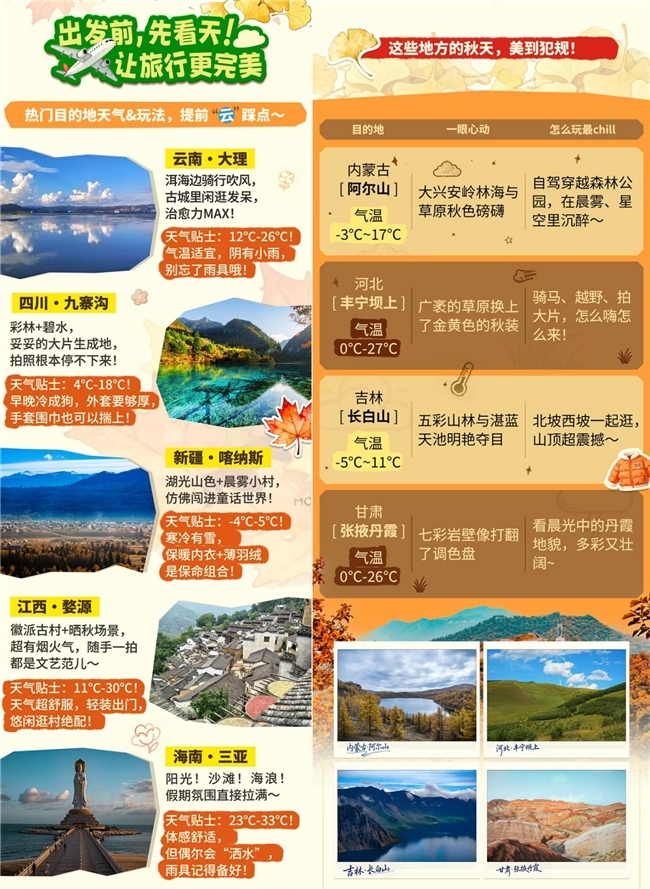 此次发布的“天”选清单以“实用导向”为核心,首先聚焦热门旅游目的地的天气与玩法。其中,云南大理阴有小雨需备雨具,洱海边骑行与古城闲逛可享治愈时光;四川九寨沟早晚温差大,需携带厚外套与手套,彩林碧水间易定格秋日大片;新疆喀纳斯需以“保暖内衣+薄羽绒”应对低温,湖光山色与晨雾小村构成“童话场景”。此外,清单还推荐了包括内蒙古阿尔山、甘肃张掖丹霞等秋日特色景点及游玩建议,如阿尔山需穿羽绒服,自驾穿越森林公园可赏晨雾星空;张掖丹霞紫外线强,晨光中的七彩岩壁堪称“自然调色盘”。贴心细致的旅游攻略,为“云”踩点提供清晰参考。