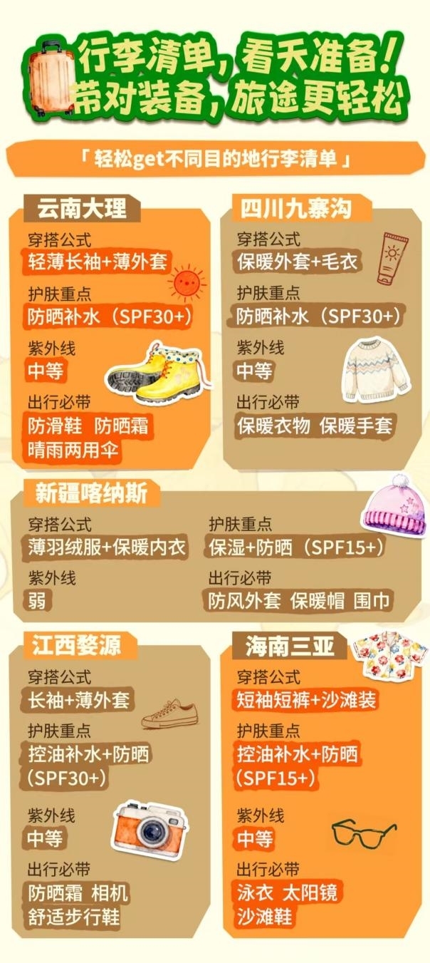 针对出行“打包难”的痛点,这份清单还结合重点目的地天气情况给出行李建议。例如大理需“轻薄长袖+薄外套”,防晒补水(SPF30+)为主,防滑鞋与晴雨两用伞必备。九寨沟推荐“保暖外套+毛衣”,保暖手套应对早晚低温。喀纳斯以“薄羽绒服+保暖内衣”搭配防风装备,抵御低温寒冷。三亚则适配“短袖短裤”,泳衣、沙滩鞋满足海滨需求,同时防范偶有降雨。婺源等气候温和地区则建议“长袖 + 薄外套”,悠闲逛古村,感受晒秋烟火气。这些建议精准匹配各地气象条件,让用户打包更高效、出行无顾虑。