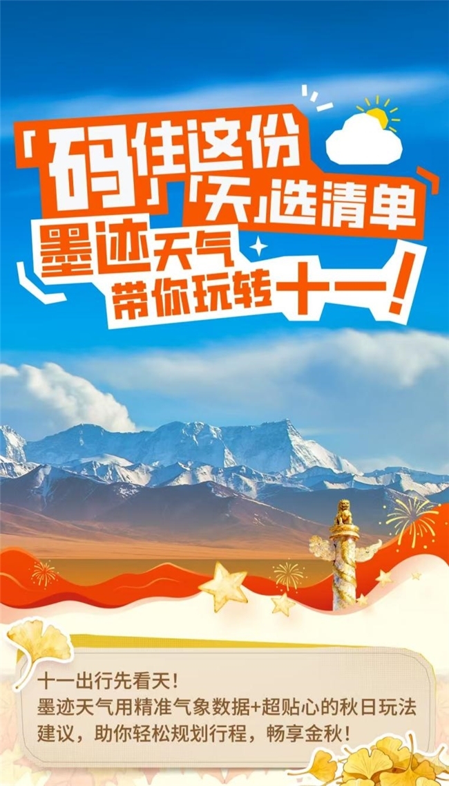 随着国庆长假临近,公众出行热情持续攀升,无论是前往热门景区饱览秋日风光,还是选择自驾探索特色路线,行程规划中“天气因素”的重要性愈发凸显。为帮助用户提前掌握各地天气动态、高效筹备出行物品、灵活应对行程中可能出现的复杂天气,墨迹天气发布十一假期出行“天”选清单,整合精准气象数据与场景化服务,从目的地选择、行李准备到行程调整、自驾保障,为用户提供全链条出行建议,助力大众畅享安心金秋旅程。