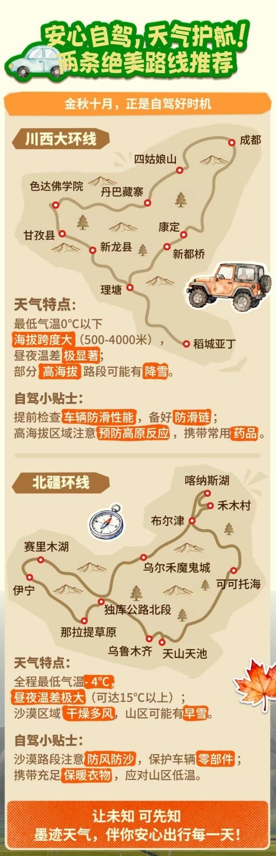 对于选择自驾出行的用户,清单也推荐了川西大环线与北疆环线两条绝美路线,并详细标注路线天气特点以供参考。经典的川西大环线全程约2400公里,途经色达、稻城亚丁、理塘等核心景区,因其行程气温低、海拔跨度大,对初级自驾者具有一定难度。自驾者需提前检查车辆防滑性能、备好防滑链,同时带好药品,防范高原反应。另一条北疆环线同样以其绝美风光闻名,该路线在十一期间预计将迎来早雪,全程最低气温-4℃,昼夜温差可达15℃以上,而且途径干燥多风的沙漠区域,用户不仅要携带充足保暖衣物,还应注意保护车辆零部件免受风沙影响。
