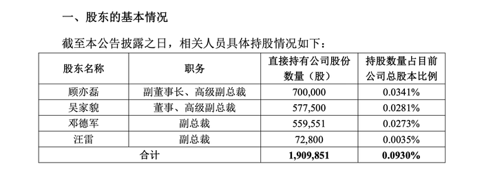 截至目前,副董事长、高级副总裁顾亦磊直接持有阳光电源70万股,占公司总股本0.0341%;董事、高级副总裁吴家貌直接持有57.75万股,占公司总股本0.0281%。两位副总裁邓德军、汪雷分别持有56万股、7.28万股。