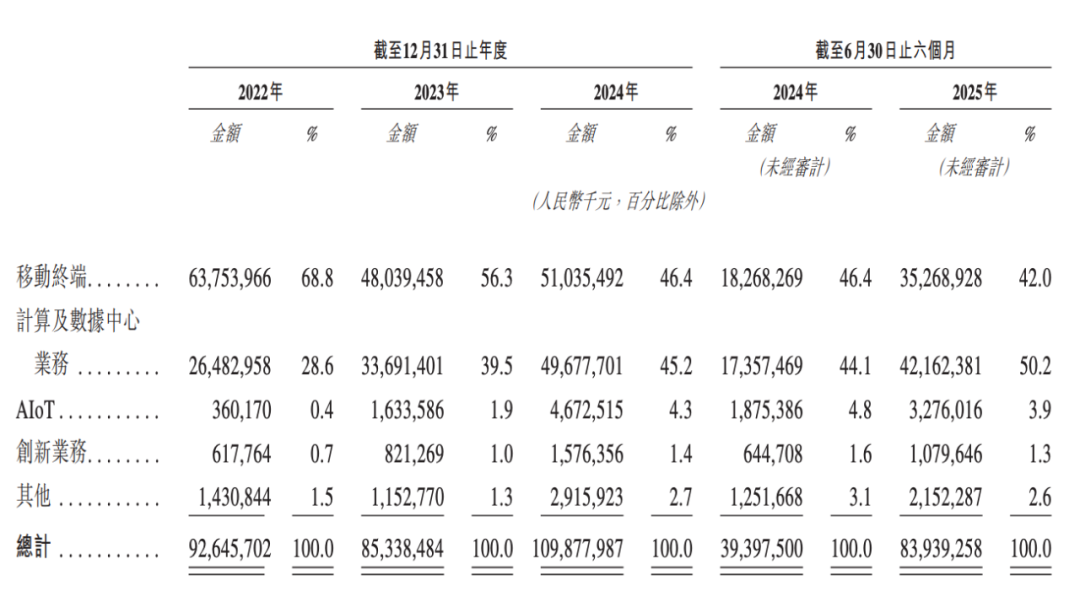计算及数据中心业务的营收分别为264.83亿元、336.91亿元、496.78亿元及421.62亿元,占比分别为28.6%、39.5%、45.2%及50.2%。