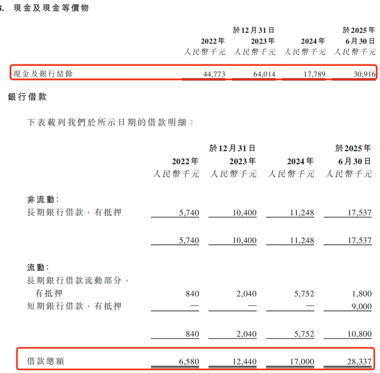 招股书显示,截至2025年6月30日,公司现金及银行结余金额为3091.6万元,长期银行借款流动部分与短期银行借款合计1080万元,留有的资金周转空间并不是很大。