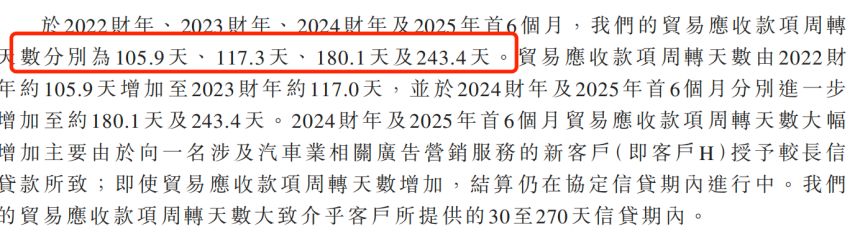 据悉,圣火科技向一名涉及汽车业相关广告营销服务的新客户给予较长的信贷期,导致公司的贸易应收款项周转天数从2022年的105.9天增长至2024年的180.1天。2025年上半年,公司应收款项周转天数进一步增长至243.4天。
