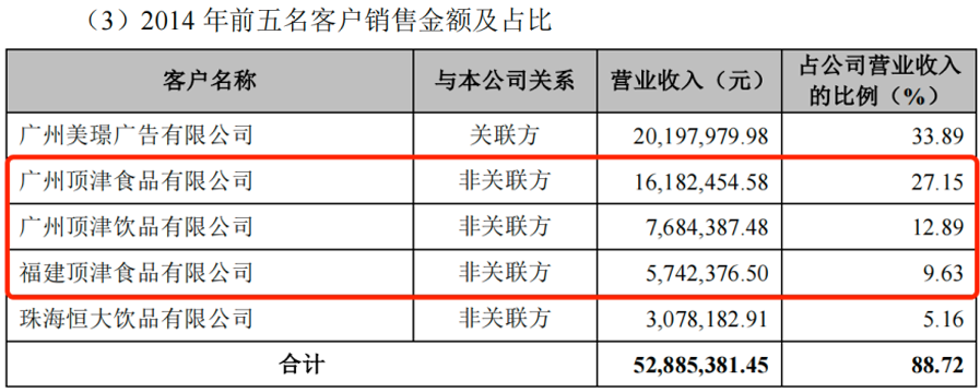 在2014年公司成立初期,康师傅的三家全资子公司广州顶津食品有限公司、广州顶津饮品有限公司、福建顶津食品有限公司均是圣火科技前五大客户,占当期营业收入的比例总计高达49.67%。