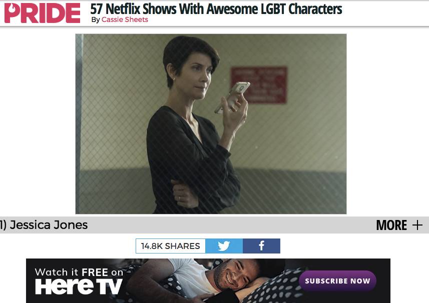 “57部网飞上有超棒LGBT角色的剧”,下面的广告HERE TV更是你们想不到的——一家专门播放同志题材影视作品的美国电视台