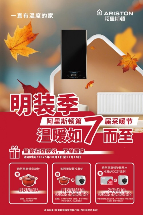 当秋风渐起、寒意初临,阿里斯顿旗下全系列壁挂炉产品以懂生活的贴心设计与创新科技,为家庭筑起温暖屏障,以全程贴心的一站式服务,化解从安装到使用的所有顾虑。阿里斯顿用科技回应生活所需,用服务承载安心承诺,让每一个家庭在秋冬无惧寒凉,在四季中拥抱舒适,让一直有温度的家融入日常生活的每一刻。2025年10月1日起至2025年11月18日,微信注册阿里斯顿会员并下单购买阿里斯顿壁挂炉参与阿里斯顿第7届采暖节,即享多重家居好礼,下单即送,助您温暖过冬!阿里斯顿以科技与服务并重,让温暖如期而至,用安心守护家的每一刻舒适。