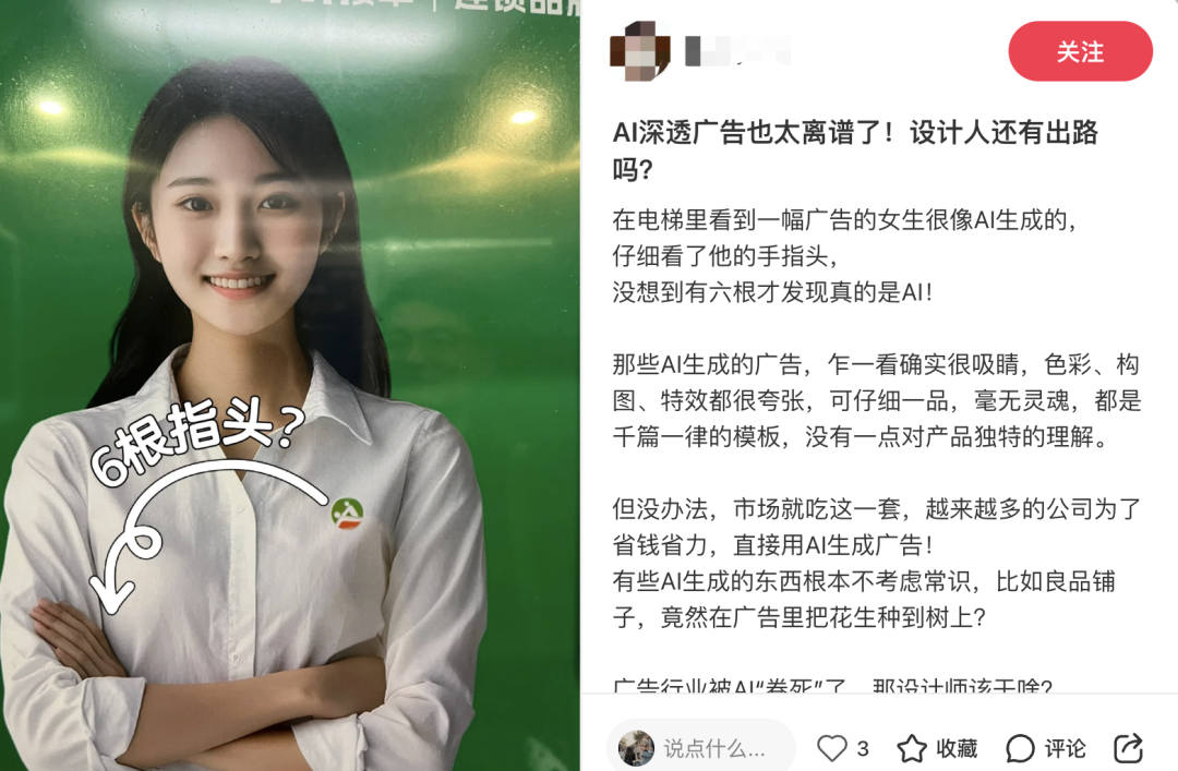 又如电梯广告中出现的AI生成的“六指数字人”。