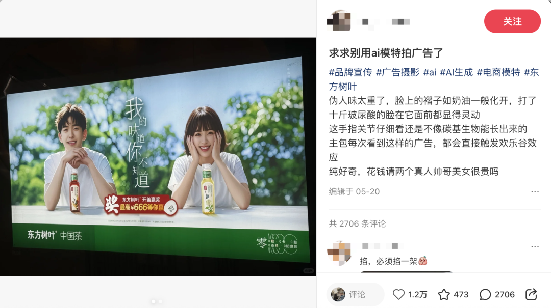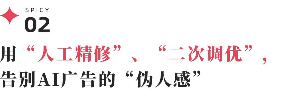 AI 并没有真正意义上解放人工,很多环节还是需要人去把关、修正甚至重做。在“人工精修”干预下,能很大程度上弱化AI广告的“伪人感”。
