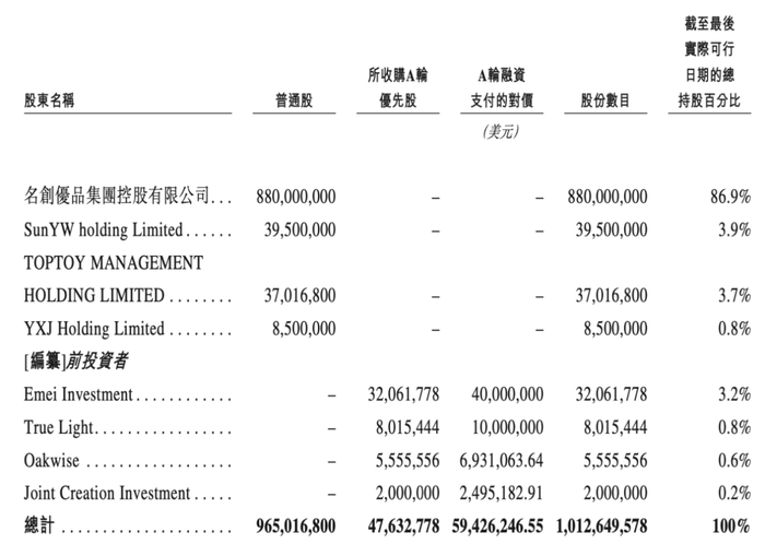 截至今年9月19日,名创优品拥有TOP TOY86.9%的股份,CEO孙元文持股3.9%。而基于投资,淡马锡(通过Emei Investment和True Light)的持股比为4%,Oakwise持股0.6%,Joint Creation Investment持股0.2%。