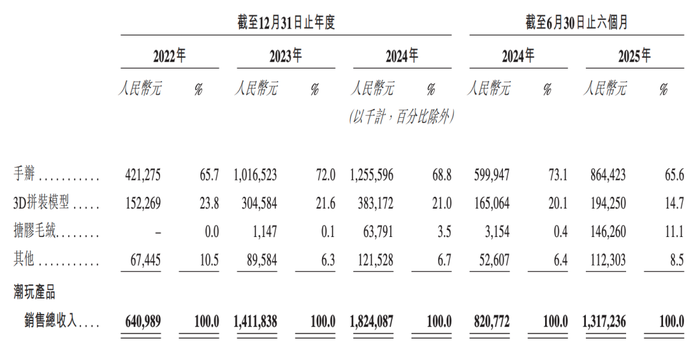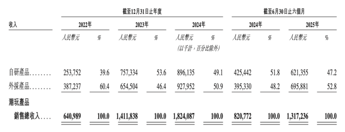 而2022年到2024年,TOP TOY的自研产品的销售收入分别为2.54亿元、7.57亿元和8.96亿元,截至2025年止六个月为6.21亿元,分别占其潮玩产品销售总收入的39.6%、53.6%、49.1%和47.2%。
