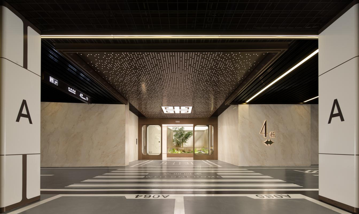 约50㎡的地下大堂,顶部整块铝板镶嵌中国传统回寰纹,寓意其上2889个孔洞,寓意归家圆满、福运相伴,生生不息。
