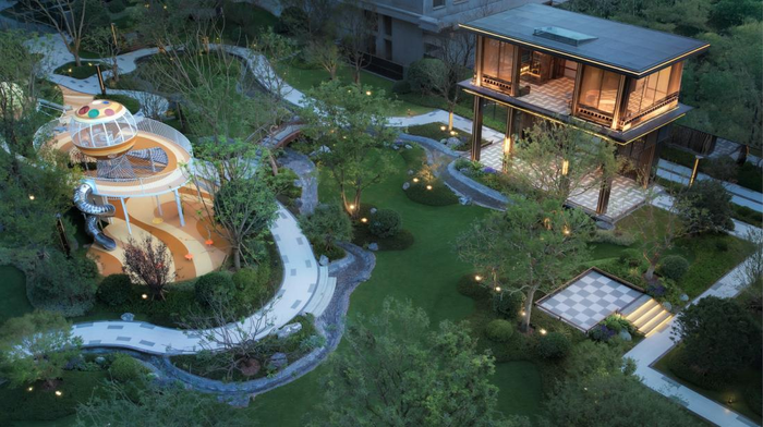 树种的选取,还加入了对于传统文化和童趣的考量。约30年树龄的入口晚樱,美好开始;约50年树龄的罗汉松,守财旺宅,事业长青;约50年树龄的丛生滇朴/乌桕,云南本地文化的绚丽多彩;约60年树龄的牛筋木,坚韧不拔,基业长青……每一棵树都不是随意种植,其品种、位置、形态都承载着对业主的美好祝福,从园林开始就是一个有灵性的生命场。