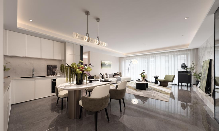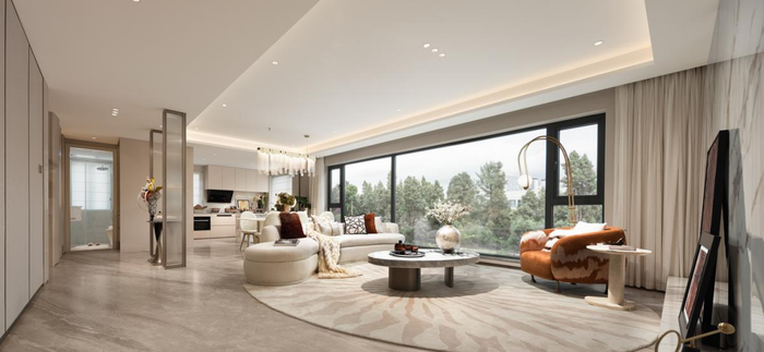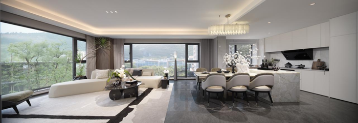 餐客厅面积高达约50㎡,LDKB一体化、餐客厅全景端厅设计,连接8.25米宽落地大玻璃窗,极致的阔绰空间和视野感知,妥妥的高端改善享受。