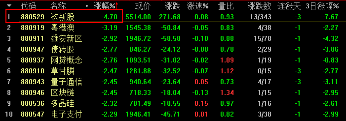 今日,市场情绪低迷,次新股再度成为跌幅榜的头号板块。