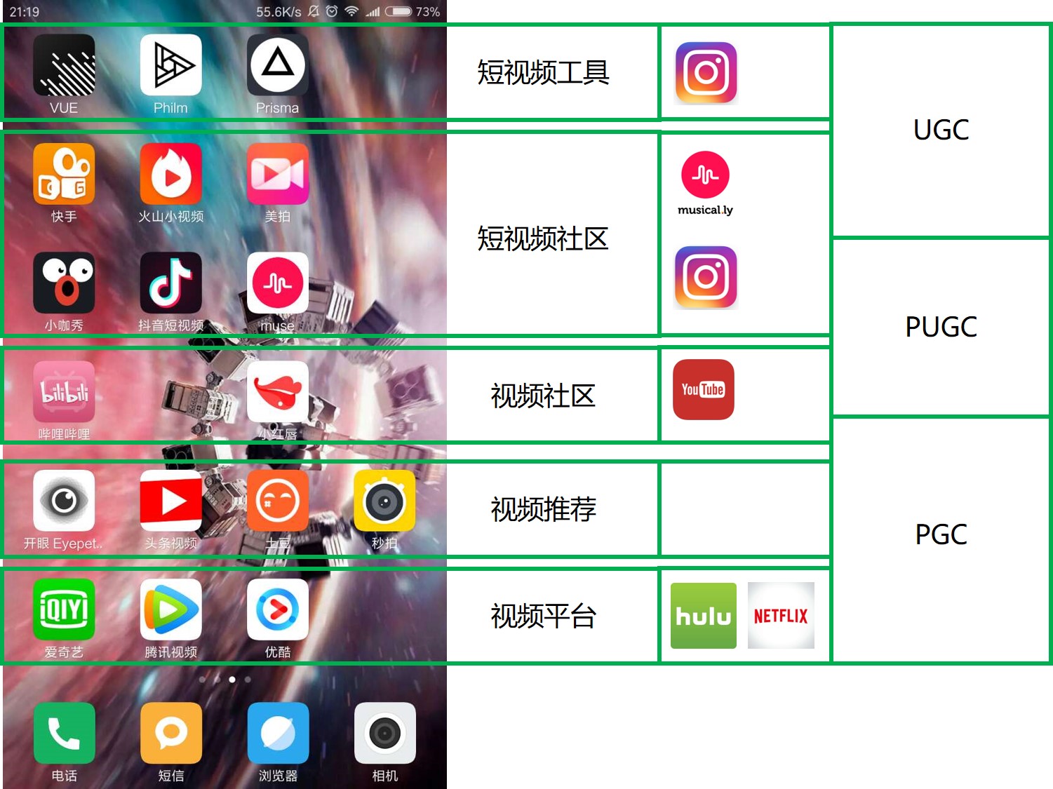 首先,我把现有的视频行业刨除直播(直播还是找个时间单独讲吧),然后把行业粗略的分成五个子类:
